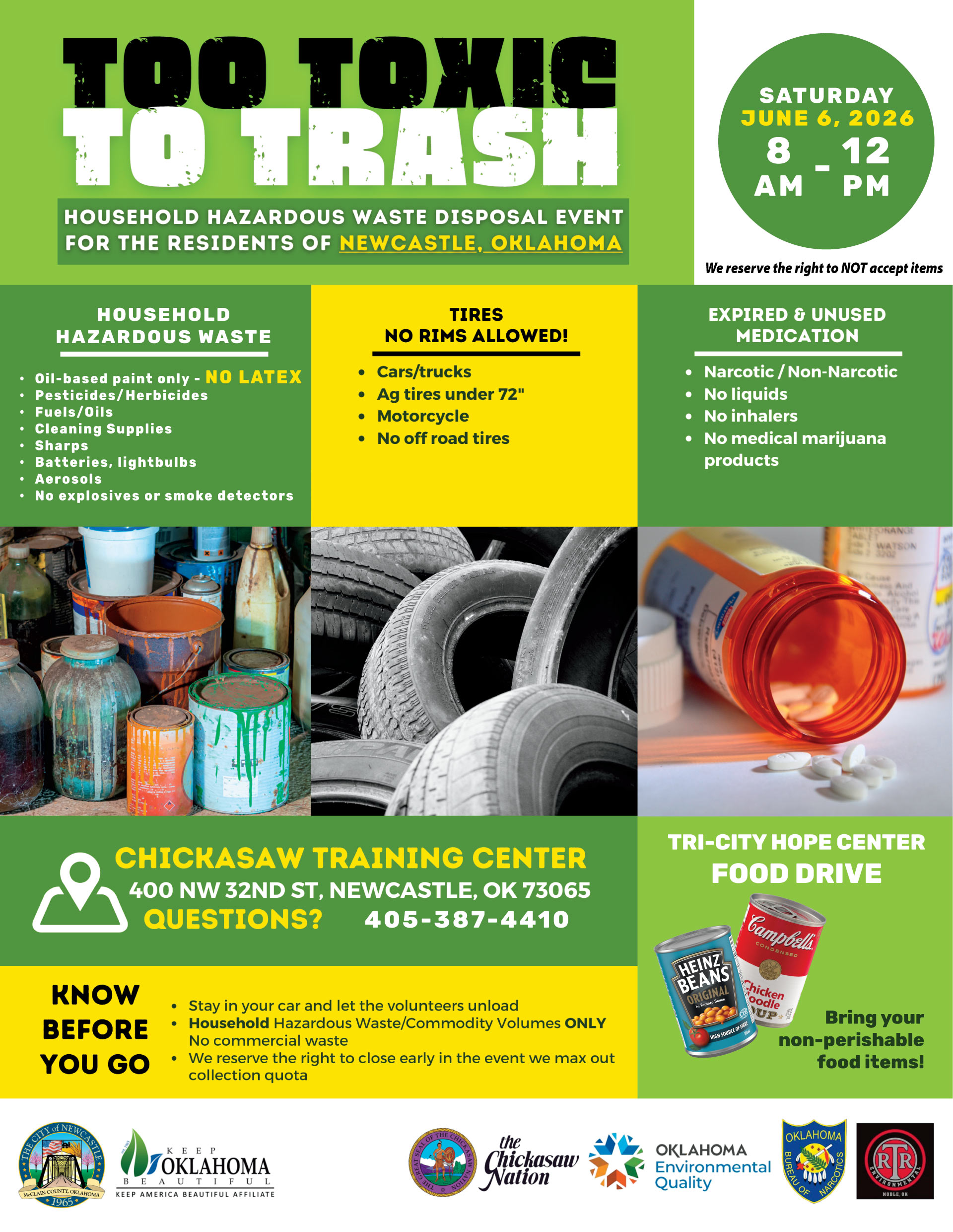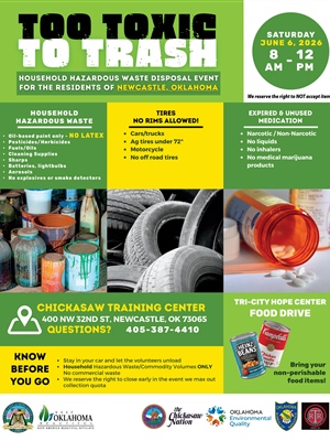 The City of Newcastle will host its annual “Too Toxic to Trash” Household Hazardous Waste Disposal Event on Saturday, June 6, 2026, from 8 a.m. to 12 p.m. at the Chickasaw Training Center, 400 NW 32nd Street. The event provides Newcastle residents with a safe and convenient way to dispose of hazardous household materials that should not be placed in regular trash or poured down drains.